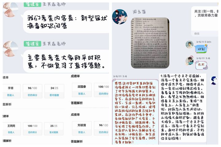 此次活动以抗击疫情为主题,通过线上签到、知识答题、书写心得体会等形式进行。由于支部成员积极响应,热情参与,且在竞赛开始前几日认真学习了相关知识,参赛同学均取得了优异的成绩。“面对严峻的疫情,全国一盘棋,民众一条心,无数党员志愿者奋战于一线,中国共产党再一次凝心聚力,带领全国人民共度时艰”,“疫情就是命令,防控就是责任”……这一刻,大家以真挚的感情书写出心中所感。