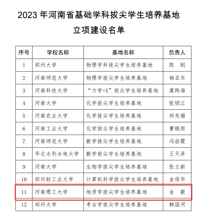 申报的“地质学拔尖学生培养基地”获批立项建设。据了解,河南省共立项建设12个基础学科拔尖学生培养基地,建设周期五年。