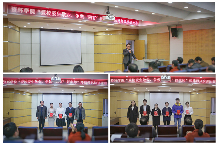在资环楼影像厅举行“爱校爱生敬业,争做‘四有’好老师”师德师风演讲比赛。该院党委书记罗绍河、院长齐永安、副书记许传阳、副院长王海邻、郑德顺、金毅等参加本次活动并担任评委,该院全体教职工观看比赛。