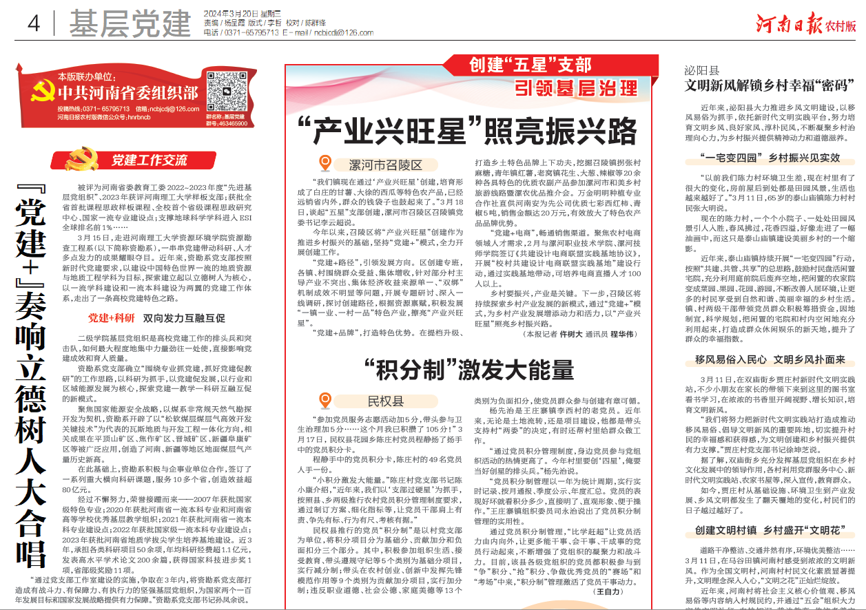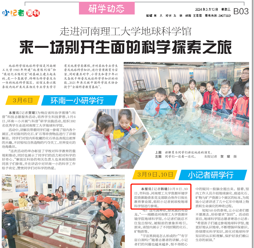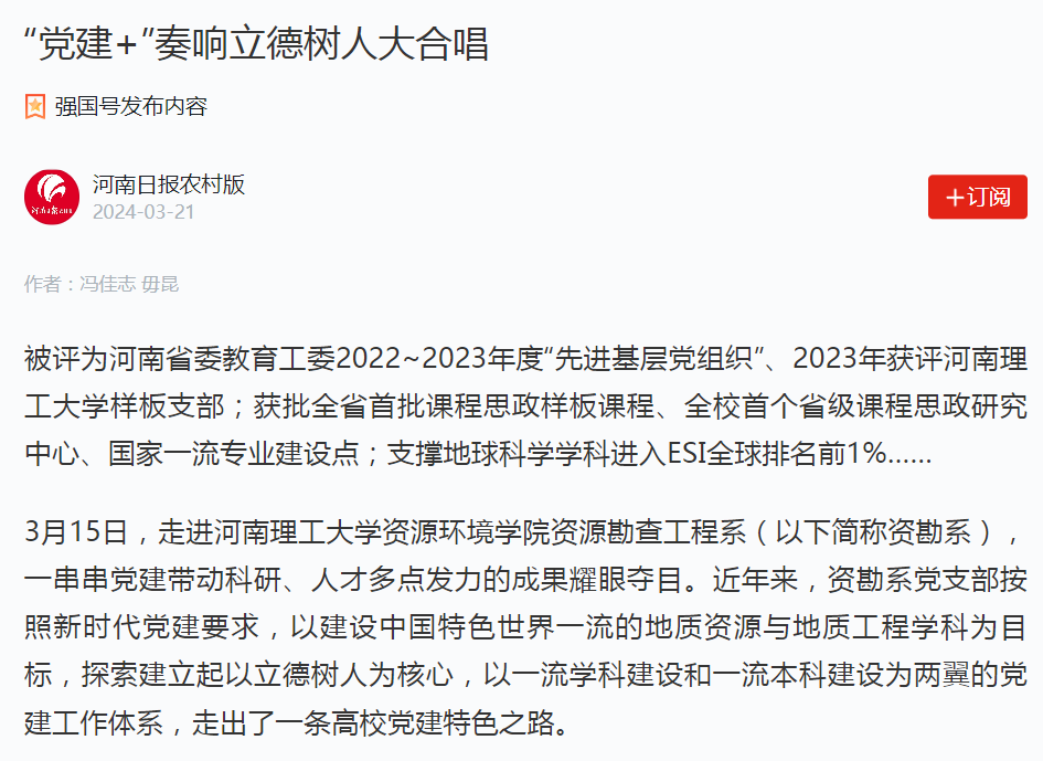 资勘系党支部按照新时代党建要求,以建设中国特色世界一流的地质资源与地质工程学科为目标,探索建立起以立德树人为核心,以一流学科建设和一流本科建设为两翼的党建工作体系,走出了一条“‘党建+’奏响立德树人”高校党建特色之路,受到河南日报客户端、”学习强国”学习平台、河南日报农村版等主流媒体广泛报道,党支部三级联创相关活动受到河南省科学技术协会、焦作市科学技术协会、焦作晚报、焦作日报教育之声视频号等媒体报道,引发热烈反响。相关内容如下:
