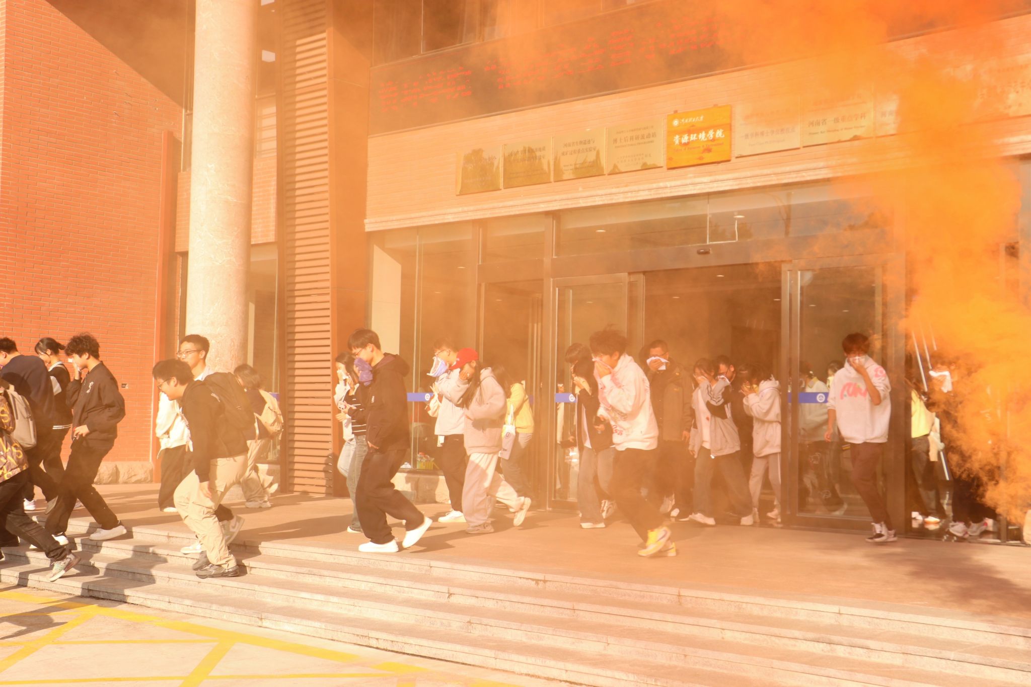 一楼、二楼、三楼顿时浓烟弥漫,现场应急疏散演练正式开始。参与演练的师生用湿毛巾捂住口鼻,在保卫处和消防志愿者的组织下快速从应急通道撤离,整个过程无拥挤情况发生,应急疏散工作井然有序。