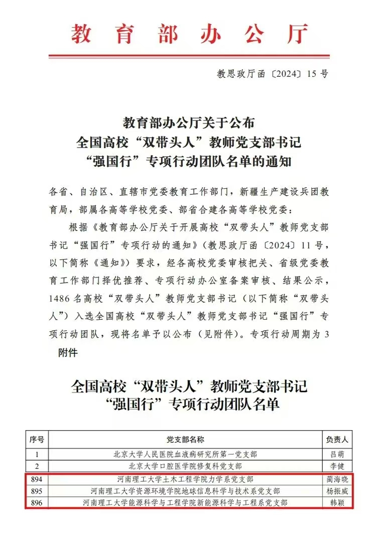 地球信息科学与技术系党支部成功入选。高校“双带头人”教师党支部书记“强国行”专项行动是教育部党组为创新落实立德树人根本任务,深入推进高校“双带头人”教师党支部书记培育工程而开展的专项行动。这一荣誉不仅是对地球信息科学与技术系党支部党建工作的高度认可,更是对我校持续推进教师党支部书记“双带头人”培育工程的肯定。