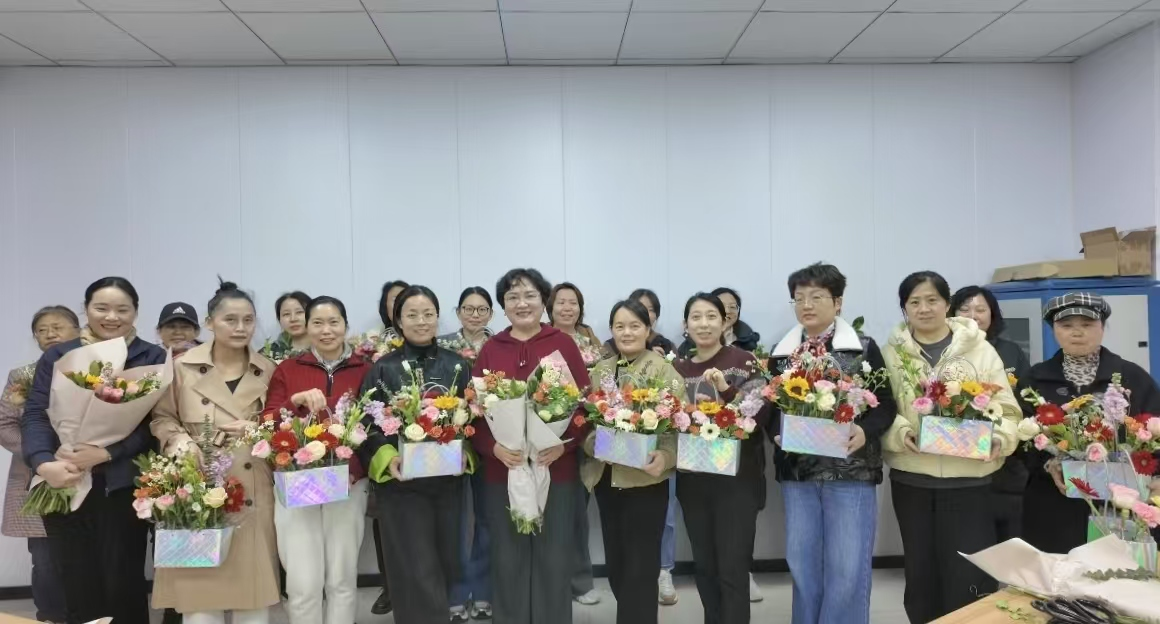 活动伊始,花艺师首结合东方美学“三主枝”构图法则,现场示范阶梯式插花的黄金比例与色彩韵律。理论讲解与示范结束后,女教职工们纷纷化身“生活艺术家”,将向日葵、玫瑰、康乃馨、洋桔梗等花材巧妙搭配、修剪、组合。现场花香四溢,欢声笑语不断,老师们或低头修剪花枝,或交流配色灵感,或互相拍照记录,一步步将手中花材变为独具匠心的艺术作品。经过一番精心创作,一件件生机盎然、错落有致的插花作品陆续完成。最后,老师们手捧花篮合影留念,镜头定格下这一温馨美好的瞬间,记录了她们在这个特殊节日里的欢乐与感动。