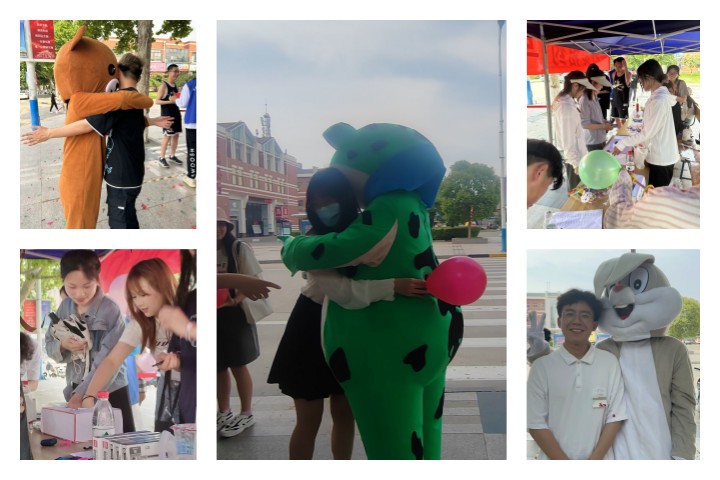 “爱的抱抱”是以参与同学将自己的烦恼写在气球上,通过与身穿可爱玩偶公仔的工作人员拥抱并挤破气球的方式来驱散烦恼。活动现场还以抽奖的形式为每一个敢于与烦恼抗争的同学赠送了关于“感恩”和“祝福”的礼物。炎炎烈日,活动的现场热闹非凡。身穿可爱的玩偶公仔、埋头打气球的工作人员、热情讲解活动的同学们,吸引了来来往往路过的同学。同学们通过拥抱挤破气球驱散“烦恼”,唤醒大家对周围人的善意和对生活积极乐观的态度。“当我勇敢地将自己的烦恼写下,而且和穿着玩偶娃娃的工作人员一起拥抱,并挤破写着“烦恼”气球的时候,内心深处也有一种异样的解脱,仿佛烦恼真如爆炸那刻消失了。这是非常有意义的一次活动。”参加活动的同学说。